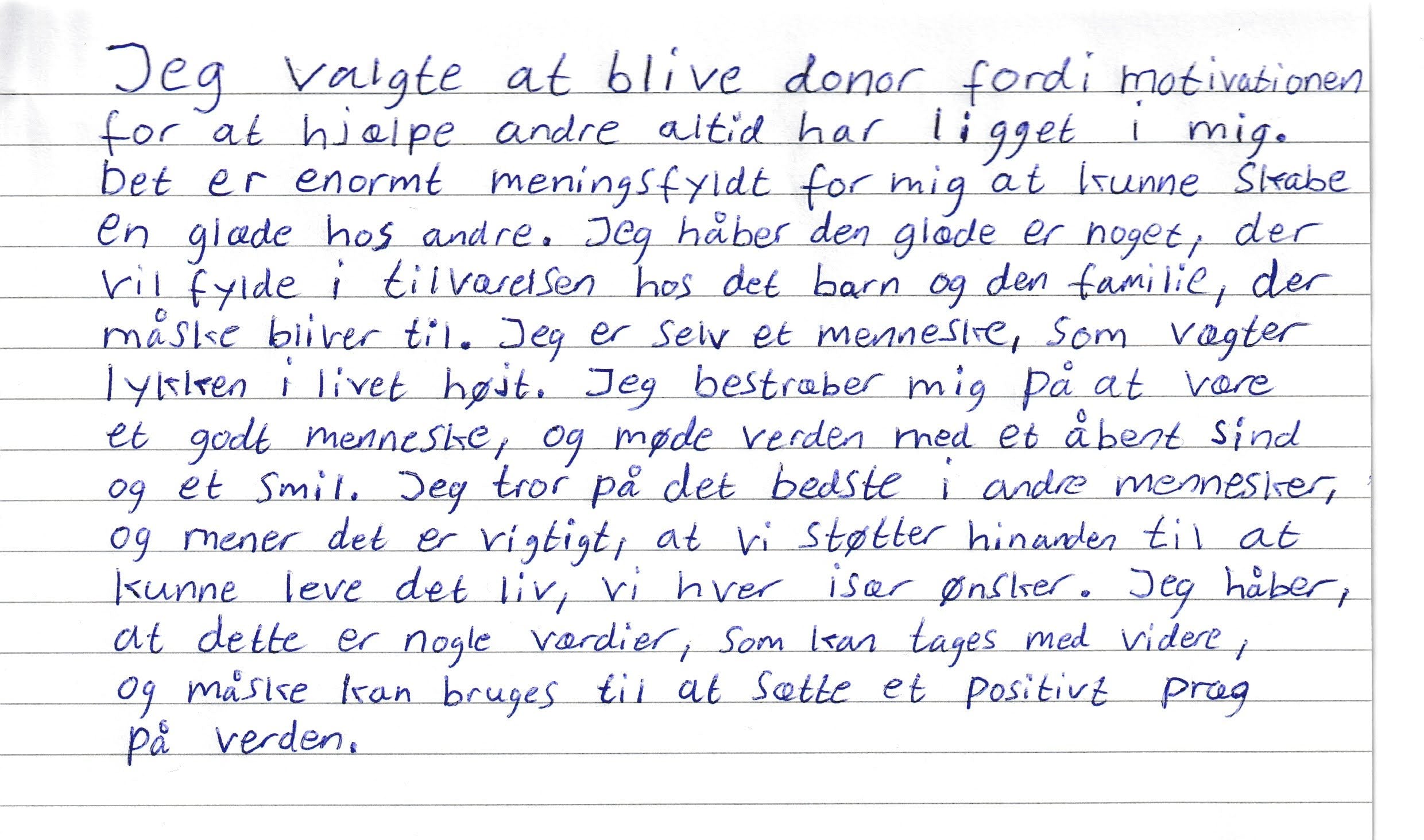 Donoren har reflekteret godt over beslutningen om at blive donor. Han har valgt at hjælpe andre, samtidig med at han får lidt ekstra indtægt. Han har drøftet beslutningen med sin kæreste og har valgt at være åben donor for at kunne give svar til fremtidige børn, der ønsker at vide mere om deres historie.