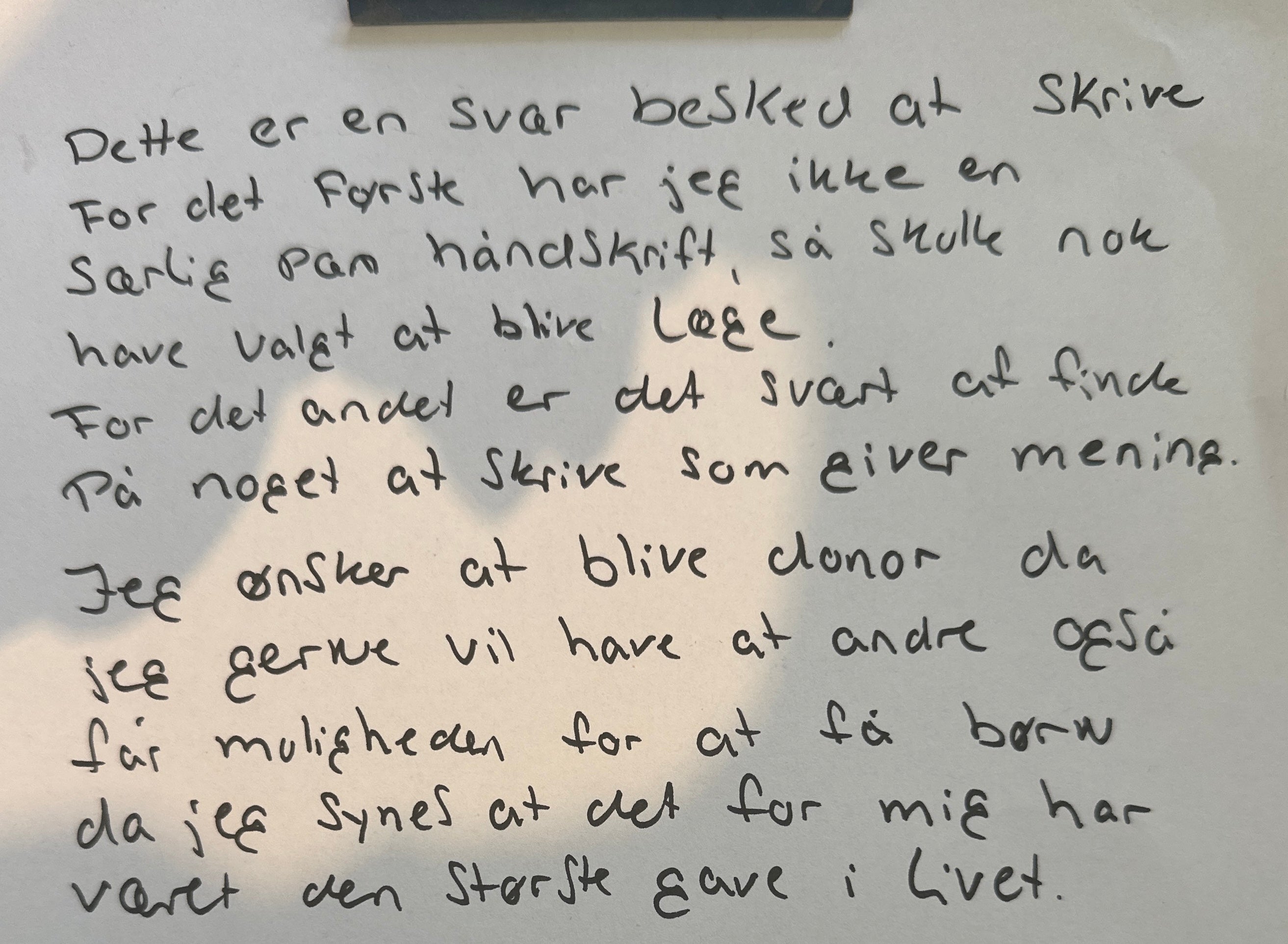The donor has chosen to become a donor, because he enjoys being a father, and he wants others to have the same opportunity. To him, it is one of the most joyful and intense experiences he’s had. He has a partner who he has discussed the decision with, and she is supportive overall.